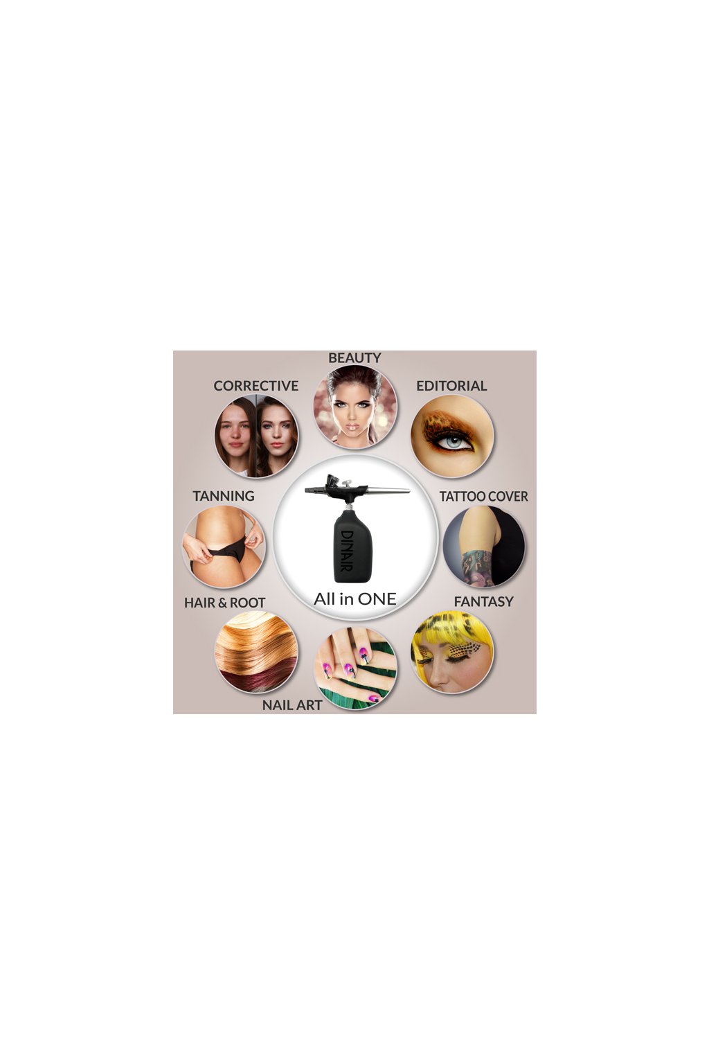 Dinair ONE is the new favorite! Cordless, rechargeable, instantly swap airbrushes. Professional and everyday use. Full Face and Body. Makeup Kit includes 10 shades of makeup and is add-on ready for Airbrush Tanning, Tattoo Cover, Hair Hightlights, Root Cover and Body Art. (This kit includes products in value 574 €).
